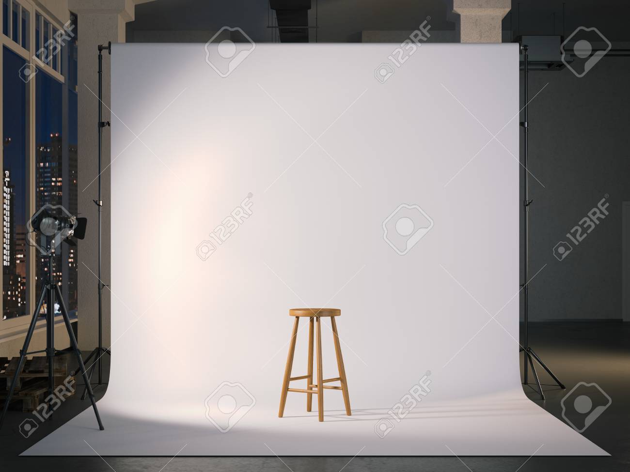 白紙スクリーンと木製の椅子が備まるモダンなフォトスタジオ 3d レンダリング の写真素材 画像素材 Image